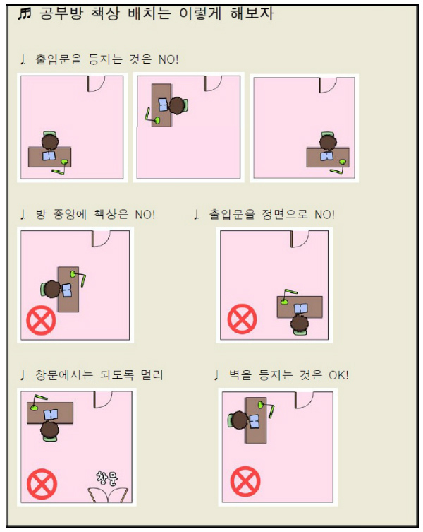 - 책상은 북향으로, 창문에서 멀리, 방문을 등지지 않게, 벽을 등지고